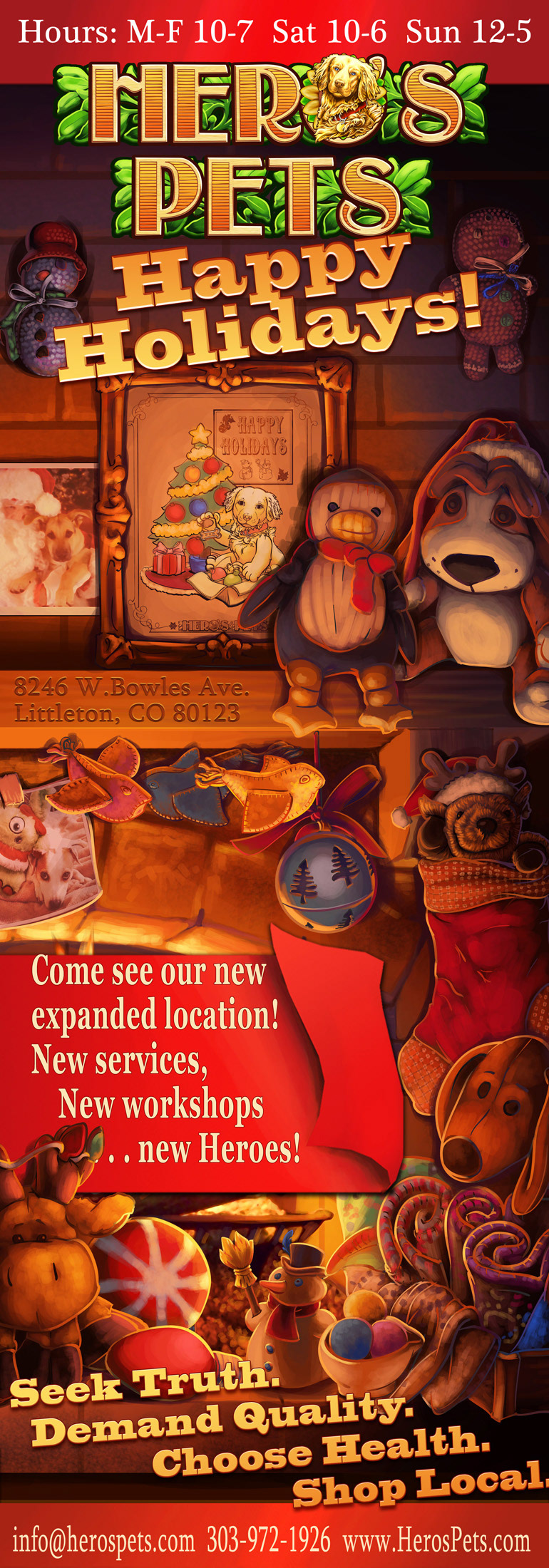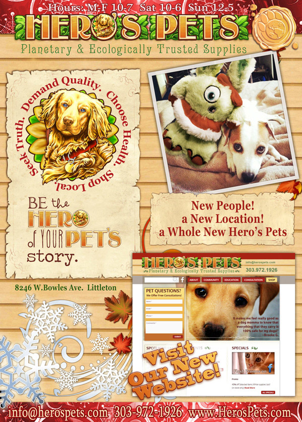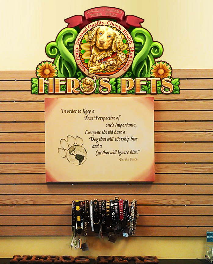 All branding, logos, product packaging, websites, text content, technical and medical writing, store design, store decor, signage, pamphlets, fliers, ads, marketing campaigns, social media, info graphics and public relations for Hero's Pets, and innovative pet supply store owned by my family.