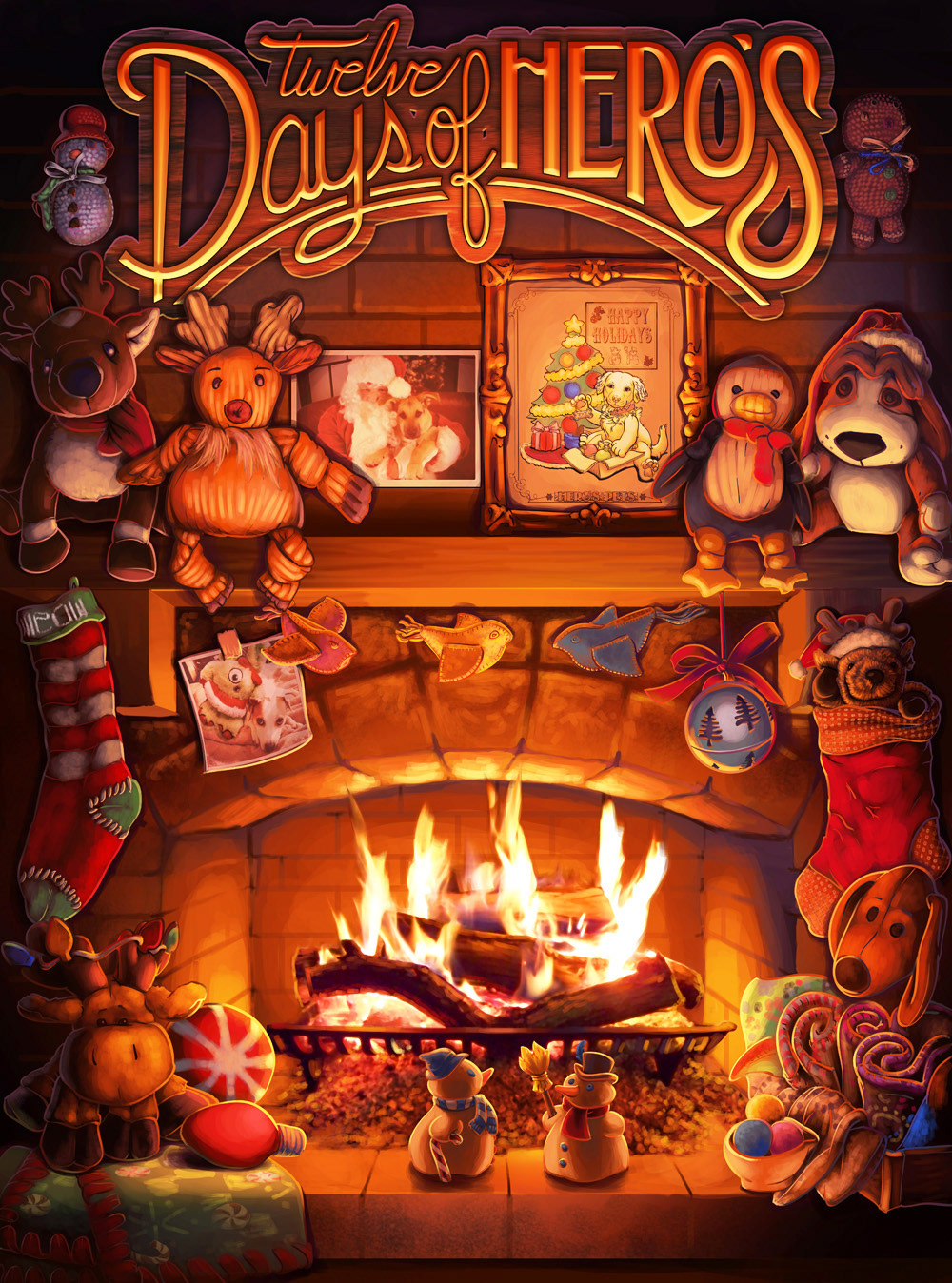 Original logos including lighted storefront signage. Text portions created in Illustrator with effects in PhotoShop. "Hero" character originally painted in oil on watercolor paper.