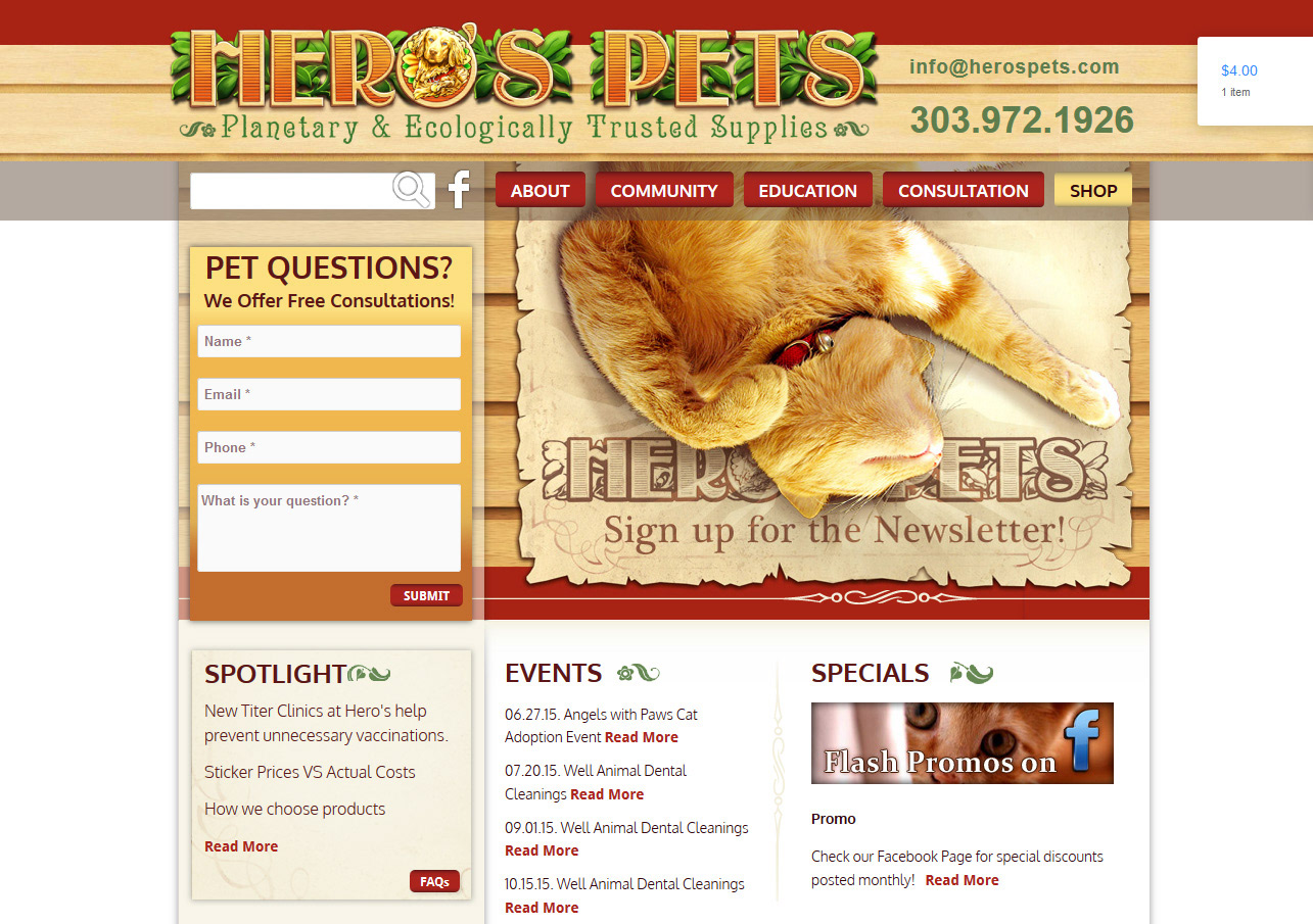 Web design, graphics and text content for entire herospets.com website. Graphics created in Adobe Illustrator and PhotoShop. Site built in WordPress.